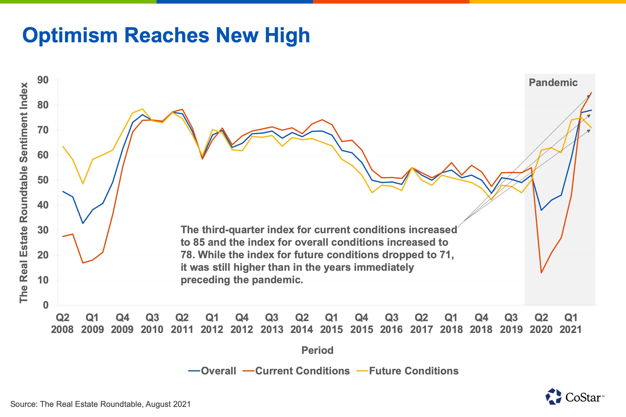 Compared to Last Year, Real Estate Executives Find a Moment of Positivity Article originally posted on CoStar on August 23, 2021 Survey Shows Industry Sentiment About Current Conditions at 13-Year High The pandemic has upended Investment real estate markets and created widespread uncertainty about when employees will return to the office. And yet, Investment real estate executives have never been more bullish about current market conditions since the Real Estate Roundtable began gauging industry sentiment 13 years ago. The trade group representing owners, developers, financiers and other real estate interests released the latest results of its quarterly survey of industry sentiment. An index quantifying people’s feelings about current conditions rose seven points to 85, the highest recorded in the measure’s history. The index scores sentiment on a scale of 1 to 100, and anything above 50 is considered positive. Real estate executives were slightly less optimistic about conditions a year from now, leaving the future index at 71, for an overall score of present and future confidence at 78, still very strong. The comparative bullishness is perhaps not surprising given a year ago the nation was still facing tough restrictions as people waited for vaccines. Few deals were getting done. Today, business is far more robust. “The Roundtable’s quarterly survey shows that 89 percent of respondents believe that general market conditions today are ‘much better or somewhat better’ versus one year ago — with an abundance of available capital compared to one year ago,” the report said. Still, uncertainty persists, the group noted. The latest survey was conducted in July as the delta variant of the coronavirus began to take hold in the United States. In recent weeks, a new wave of infections and resistance to vaccinations has led some communities to reimpose mask-wearing mandates and take other actions. A dip in optimism about conditions a year from now likely reflects continued concern over the course of COVID-19. About 89% of real estate executives say property values are somewhat and much higher now than a year ago, and nearly three-quarters expect that to continue a year from now. Large majorities of Investment real estate executives also say the availability of capital is better than it was a year ago, and most expect that to be about the same or better a year from now.