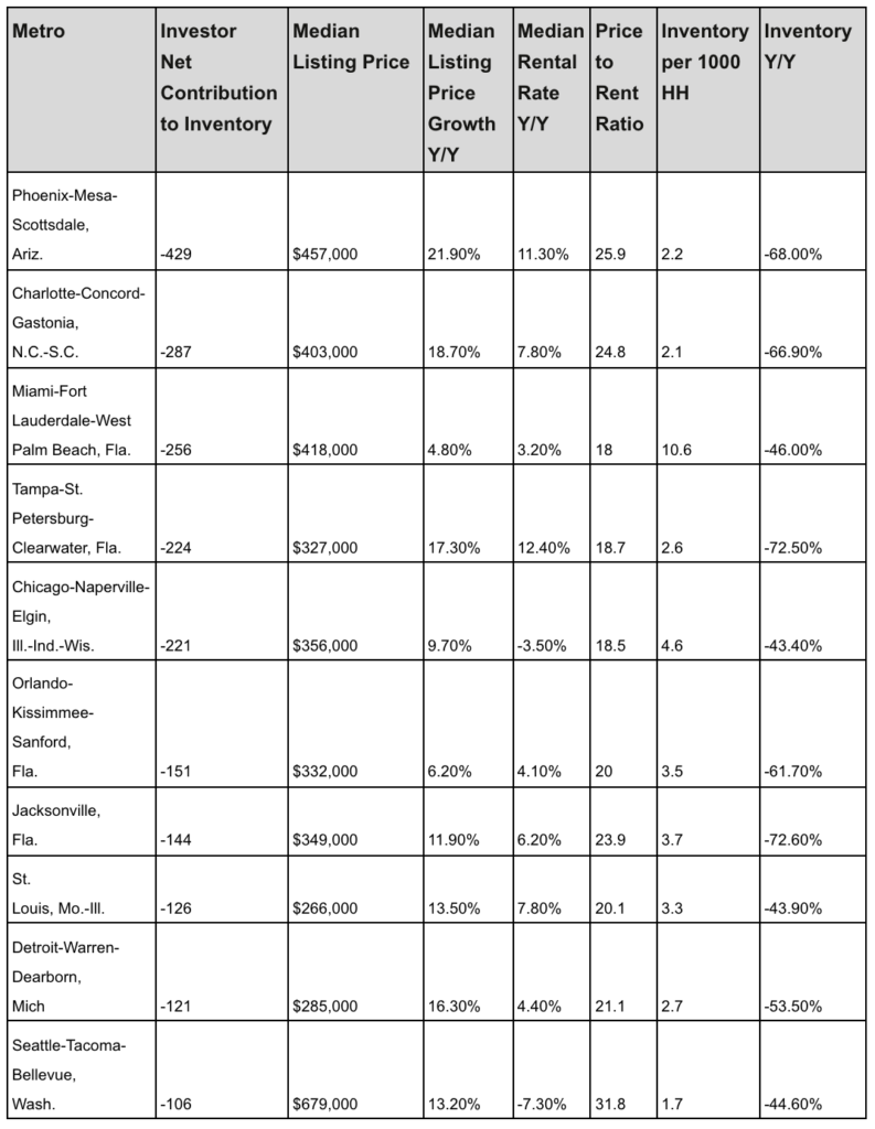 Phoenix No. 1 housing market negatively impacted by Investors Article originally posted on AZ Big Media on July 30, 2021 Phoenix investors had a significant impact on the housing market in April, taking away 429 units of inventory. Nationally, investors took more inventory off the market than they contributed in April; with their purchases representing 5.7% of all home sales. Despite the common perception that investors are always in competition with everyday buyers, new findings from the Realtor.com Investor Report shows that isn’t always the case. According to the data, investors are exacerbating the inventory shortage in 31 of the top 50 U.S. markets, but in roughly 19 markets – including Atlanta, Dallas, Baltimore, Los Angeles and San Francisco – they are actually helping to replenish the number of homes for sale. Realtor.com analyzed U.S. deed records from January 2000-April 2021 to determine the number of investor sales versus purchases in the 50 largest U.S. markets. In this report, areas where investors are contributing inventory refers to places where investors are selling more homes than they are buying. Places where investors are taking away inventory are locales where investors are buying more homes than they sell, including Phoenix investors. “Today’s buyers are facing a tough market and data shows they aren’t just competing with each other. With deep pockets and more flexibility, investors can be daunting competition for the typical homebuyer. Right now, data shows investors are buying more homes than they are selling, and while they get a lot of attention in today’s market, it’s worth remembering that they can also contribute to inventory levels,” said Realtor.com® Chief Economist Danielle Hale. “Whether a market is appealing to investors depends on a variety of factors, including how local home prices compare to rents. When home prices are rising and rents are more stagnant, investors are more likely to sell off properties and contribute inventory. On the other hand, the higher rents are compared to home prices the more attractive the market is to investors looking to buy homes and convert them into rental properties.” Phoenix investors are snatching up homes Investors took away inventory in 31 of the largest U.S. markets, led by Phoenix investors (-429 homes), Charlotte, N.C. (-287 homes), Miami (-256 homes),Tampa (-224 homes) and Chicago (-221 homes). Compared to the markets where investors helped buyers, these metros are smaller and less crowded, with more available home listings relative to all households, lower home prices, and relatively higher rental price growth. Top 10 Markets by Net Negative Contributions to Inventory While average home prices are more affordable in these top markets, rental prices grew at a faster year-over-year pace on average (+4.6%) than in top markets with more investor sales (+0.1%) in April. In Tampa, where the $327,000 median listing price was below the national average of $375,000 in April, rents grew 4.5 times faster than the national rate, up 12.4% year-over-year. The markets where investors are competing with homebuyers and taking away inventory tend to offer the perfect storm of factors for converting homes into rental properties. These markets have relatively more homes available, at 3.7 properties for every 1,000 residences versus 2.8 in markets where investors are adding to inventory. While these metros have experienced more rapid year-over-year inventory declines in April (-57%), rapid rent price gains keep calculations favorable for buying which means that until rent trends change, investors are likely to be homebuyer foes, not friends. “Getting ahead in today’s market is tough, especially when you are contending with professional investors,” said Lexie Holbert, home and living expert at Realtor.com®. “Setting up price alerts on Realtor.com® is a really helpful trick for getting ahead of the competition. When a home that meets your parameters hits the market, you’ll get a notification so you can get in and try to make an offer.” Investors help buyers in big metros with limited homes for sale In April, investors added to the number of homes on the market in 19 of the 50 largest U.S. metros, with Atlanta (+399 homes), Dallas (+239 homes), Baltimore (+188 homes), Los Angeles (+112 homes) and San Francisco (+93 homes) seeing the biggest contributions. Compared to the markets where investors took away inventory in April, these metros tend to be bigger, with fewer homes for sale and higher listing prices. Compared to nationwide inventory declines in April (-53%), the top 10 markets where investors are contributing saw a smaller drop, at an average -44% during the same timeframe. However, some of these metros saw even bigger inventory gaps from last year, including the two markets where investors contributed the most inventory in April: Atlanta (-63.4%) and Dallas (-69.7%). At an average population size of 5.5 million, these markets also encompass some of the nation’s biggest tech hubs, such as San Francisco and San Jose. Home to some of the most expensive real estate in the U.S., these metros had an average median listing price of $668,000 in April, well above the national median price of $375,000. Hale added, “High home prices, slower rent growth, and uncertainty over the future of work in these markets are likely causing investors to reevaluate their property portfolios in these areas. And with homes still selling quickly, even in these metros, an investor deciding to sell can look forward to being able to reposition their dollars elsewhere in a very short period of time.”